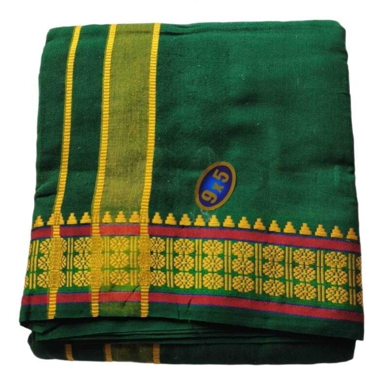 Elite Green Cotton Dhoti 9×5 with traditional border. Soft, breathable and perfect for pooja, festivals and daily wear.
